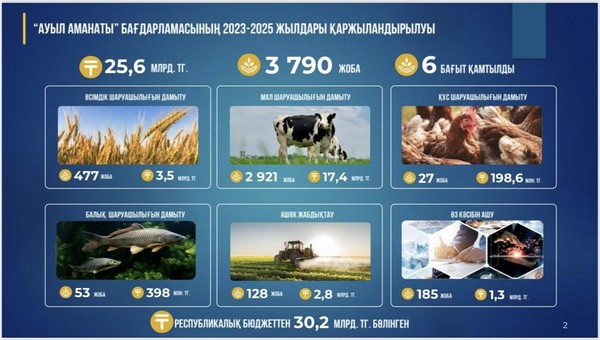 Бағдарламаның жүзеге асуы өңірімізде айқын әрі нақты нәтижелер көрсетті. Оның ішінде ауылдық жердегі шағын кәсіпкерлік 3 662 бірлікке артты, 23,2 гектарға 477 бірлік жылыжай кешені салынды. Мал басы 72 982 бірлікке ұлғайды, 39 қайта өңдеу кәсіпорны іске қосылды, 4 174 жаңа жұмыс орны ашылды. Атаулы әлеуметтік көмек алушылар саны 441 адамға қысқарды. Жалпы, осы бағдарлама аясындағы жобалар есебінен жыл сайын шамамен 30 млрд. теңгенің ауыл шаруашылығы өнімі өндіріліп отыр.