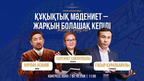 Қоғамдағы құқықтық сауаттылық пен мәдениетті арттыруды мақсат еткен жастарға арналған форум 7 қазан күні сағат 11:00-де Түркістан қаласындағы Конгресс холлда өтеді. Бұл туралы Түркістан қаласы әкімдігінің баспасөз қызметі хабарлады.